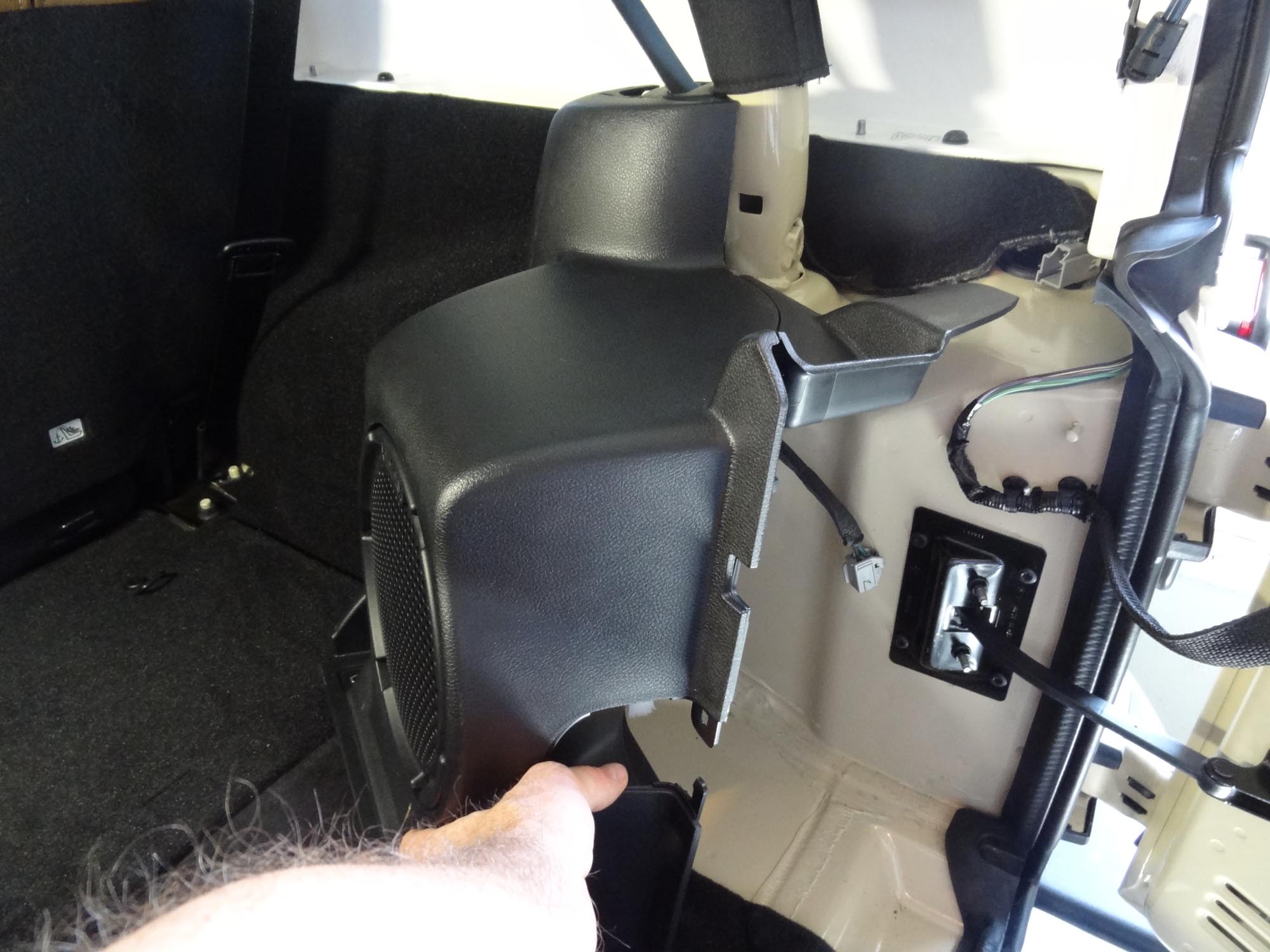 Chris, I cut out (made a really big notch) in the 1PU13DX9AH RH lower trim panel so the Stealthbox could fit snuggly in it against the fender and tail light box. I spent a lot of time measuring and re-measuring to get it right. It was a little complicated to eliminate guessing but worth the effort. Now that I know what cuts to make its actually an easy modification and could use a little hindsight tweaking. Your advice about the spacing issue was spot on. I expected it and used my hole saw to make 3 large washers out if HDPE 1/4″ plastic sheet. That spaced out the front mount bolt 3/4″. Sturdy and clean looking. Since I had also cut out the trim panels front support, when I modified it to make room for the sub, I made a small metal black painted angle bracket to replace it and attached it to the same bolt. That gives the trim bezel roll bar area the stability it needs. I have minimal grille clearance but I do have clearance.